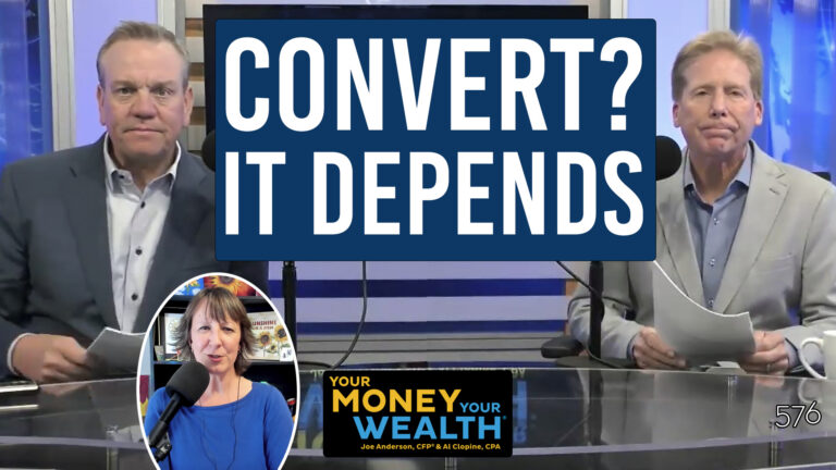 Andi: Big Tex, Paul in Maryland, and Nick in Alabama all need to know how much money they should convert to Roth to pay as little tax as possible, today on Your Money, Your Wealth® podcast 471. Johnny and June forgot to convert their backdoor Roth money – are they in trouble? Darren in Nevada has no plans at all to do Roth conversions, but surprisingly still listens to YMYW, and still wants a spitball on his retirement and real estate investment strategies. Plus, can Lolly Pop in New Jersey be less miserly and back off on saving for retirement? Can John in South Carolina use this year’s lower income to reduce his Medicare premiums? And finally, if Ordinary Guy in Boston meets an untimely demise, should that change his plans to retire early? If you thought the fellas spitballed on fat wallets last week wait ’til you hear this show. I’m producer Andi Last, with the hosts of Your Money, Your Wealth®, Joe Anderson, CFP® and Big Al Clopine, CPA, and we’ll kick things off today with a few priority voice messages.